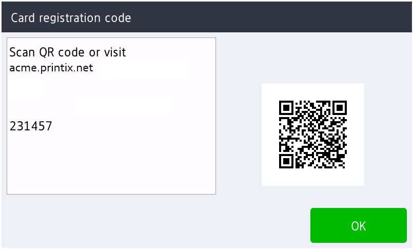 Vráťte sa na obrazovku, kde sa na ovládacom paneli zobrazuje možnosť Vložte kartu alebo stlačte OK, vyberte možnosť OK a potom možnosť Nepamätám si kód, čím otvoríte novú obrazovku s QR kódom. Pomocou fotoaparátu v telefóne alebo tablete naskenujte QR kód, čím otvoríte ponuku Karty a kódy v Printix App alebo prejdite na poskytnutú URL adresu a obnovte svoj PIN kód.
