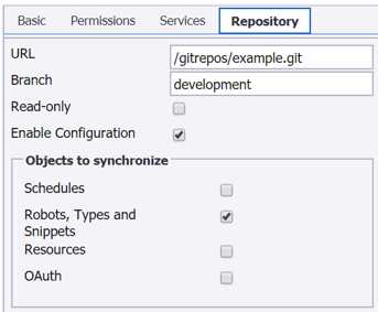 Under Objects to synchronize, select the objects to include in the synchronization: Robots, Types and Snippets.