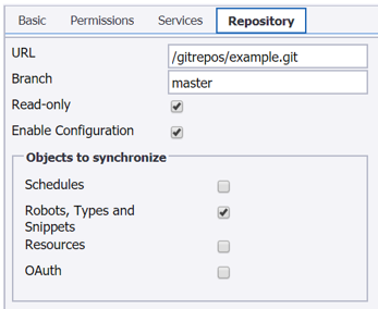 In the URL property, type the path to the repository that you created in in the previous topic: /gitrepos/example.git/