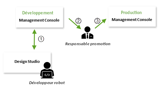 Lorsque le responsable de la promotion envisage un projet pour la production, il effectue une sauvegarde de ce projet (2) ou d'objets particuliers du développement Management Console et télécharge ensuite la sauvegarde (3) vers la production Management Console.