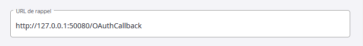 URL de Redirection : Précisez l'URL de Redirection. Pour la procédure de l'exemple Twitter, entrez http://127.0.0.1:50080/OAuthCallback.