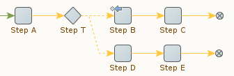 Si l'étape B est exécutée avec succès, l'exécution des étapes se déroule comme suit : « A, T, B, C. ». Comme la première branche sortant de T s'exécute sans erreur, la deuxième branche n'est pas exécutée du tout.