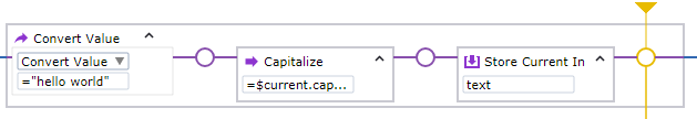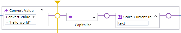 実行を続けると、エクスプレッションはコンバータによって大文字になり (次の例では =$current.capitalize())、変数 $current には新しい値"Hello World"が割り当てられますが、$initial の変数値は変わらず残ります。$current 変数の新しい値"Hello World"は、 現在のイン ステップを保存が実行された後、テキスト タイプの変数 text に保存されます。