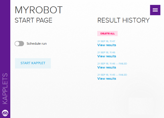 Kapplet を開始すると、対応する新規 Kapplet 実行が結果履歴ページにリストされ、対応する結果ページが結果履歴ページの右側に表示されます。アクティブな (まだ削除されていない) Kapplet 実行は常に保存され、対応するインストール済みの Kapplet の結果履歴ページで見つけることができます。関連する結果履歴ページのエントリをクリックして、対応する結果ページを開くことができます。次の例は、「Myrobot」Kapplet の結果を示します。