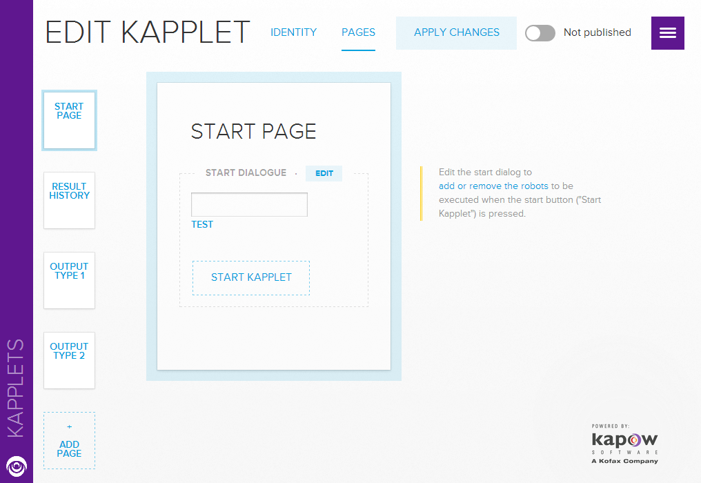 注 ID セクションは、ロボットが Kapplet に追加されていない場合にのみ表示されます。ロボットが追加されている場合は、ページ セクションが表示されます。