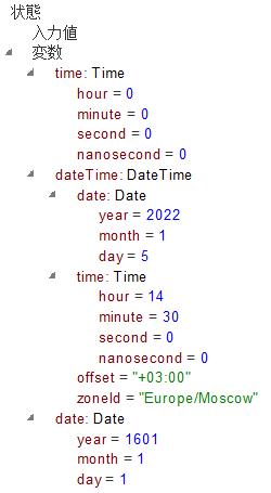 次に示すように、Date、Time、および DateTime の値は、 [状態] ペインの [変数] セクションに反映されます。ロボットの編集中に値をダブルクリックして新しい値を入力することで、[状態] ペインで変数の値を一時的に変更できます。他の値と同様に、year、hour、offset など、Date、Time、および DateTime の値の個々の部分を変更できます。