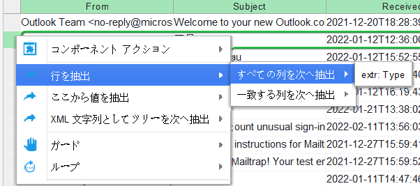 属性名とそのタイプのみに一致する列からデータを抽出するには、行の左にあるインジケータを右クリックし、[行を抽出] > [一致する列を次へ抽出] > [extr:]<コンプレックス タイプ名> の順に選択します。ロボットのワークフローに、選択したコンプレックス タイプに一致するセルの数と同じ数の [データの抽出] ステップが表示されます。データを編集および設定し、ロボットのワークフローの次のステップに進みます。