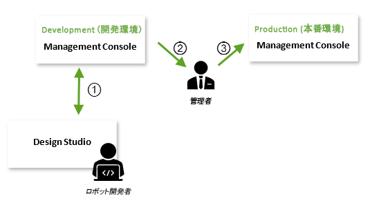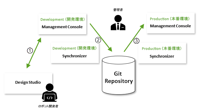 この設定例では、ロボット開発者は開発用 Management Console に保存されているプロジェクトとの同期を確立し (1)、新しいオブジェクトを作成するか既存のオブジェクトに変更を加えて、この Management Console とプロジェクトを再同期します。