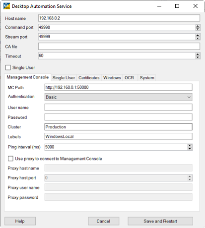 このオプションを Desktop Automation サービスに選択し、Management Console への接続時にプロキシを使用します。必要なパラメータはすべて次のフィールドで指定されます。
