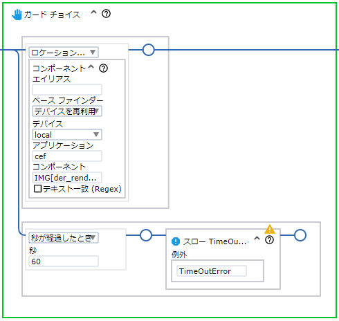 ガード チョイス ステップは、複数のアクションと関連付けられた多くの条件を設定する際に使用します。条件またはガードのいずれかが最初に満たされると、その関連付けられているアクションまたはステップが実行されます。これは一般的に、ボタンなどのインターフェイス エレメントに移動してクリックをする前に、エレメントが存在することを確認するために使用されます。無制限に待機しないように、タイムアウト ガードが追加されます。Kofax RPA では、ロケーションとタイムアウト ガードを使用して、ロボットが必要なエレメントを見つけ、設計どおりに動作するようにできます。