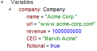 次の値のテキスト値: {"name":"Acme Corp.", "url":"www.acme-corp.com", "revenue":1000000000, "CEO":"Marvin Acme", "fictional":true} |