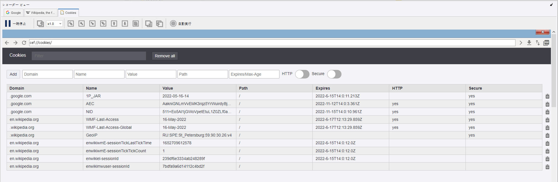 Chromium 組み込みブラウザで Cookie を管理するには、「ブラウザ」ステップを挿入して、[Cookie] ページを開きます。次に [ブラウザ] で [Chromium] を選択し、[URL] フィールドに cef://cookies と入力して、ステップを実行します。