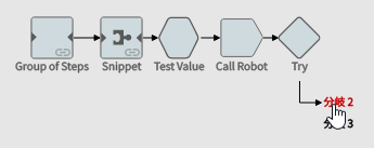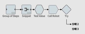 たとえば、ベーシック エンジン ロボットのほとんどのアクション ステップは四角形で表示され、トライ ステップは菱形で表示されます。