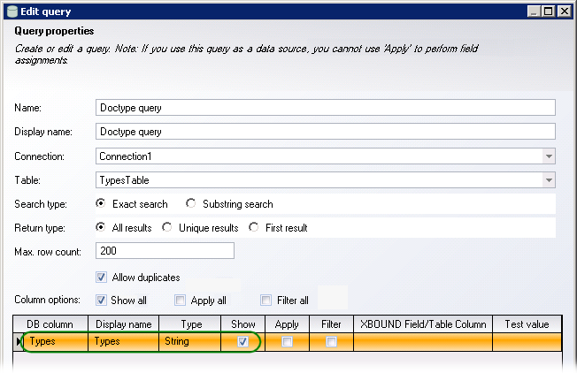Med Validation Designer kan du konfigurera en passande masterdatafråga med en lista över de externa typerna. (Du kan hitta instruktioner för hur du skapas en sådan fråga i ReadSoft Capture Framework-hjälpen.) I dialogrutan väljer du endast kolumnen . (