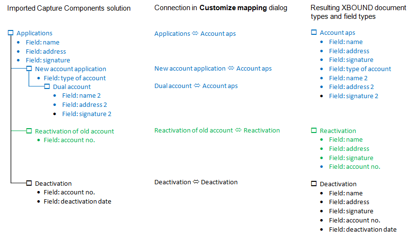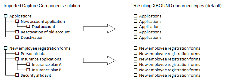 När du har importerat en lösning från Capture Components Administration skapas en standardanslutning mellan den importerade lösningens och dokumenttyperna i XBOUND: De översta dokumentspecifikationerna i strukturen länkas till XBOUND-dokumenttyper med samma namn.