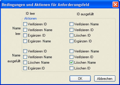 Ein Formular, mit dem Unternehmen einer Behörde mitteilen können, welche Mitarbeiter angestellt wurden, enthält Felder für den Namen des neuen Mitarbeiters (Feld Name) und eine eindeutige Nummer, wie zum Beispiel die Sozialversicherungsnummer (ID). Wenn die Sozialversicherungsnummer ausgefüllt ist, benötigen Sie die Daten im Feld Name nicht, da diese in Ihren eigenen Datenbanken gespeichert sind. In diesem Fall könnte die Anforderungsfeldmatrix folgendermaßen aussehen: