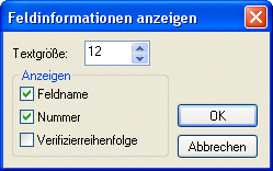 Beim Bearbeiten einer Formulardefinition können Sie mit ð Feldinformationen das Dialogfeld Feldinformationen anzeigen aufrufen. In diesem Dialogfeld können Sie auswählen, welche Informationen FORMS in den Feldern anzeigen soll.