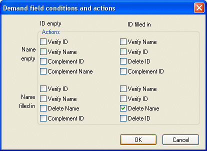 A form that employers use to report to you (a government authority) which employees they have hired contains fields for a new employee’s name (call the field Name) and identity number (ID). If the identity number is filled in, you do not need the data in Name because it is stored in your own database. Here is what the demand field matrix might look like: