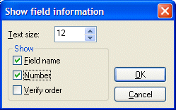 When you are working on a form definition, select ð Field information to access the Show field information dialog. Here you can select which information you want FORMS to show with each field on the screen.