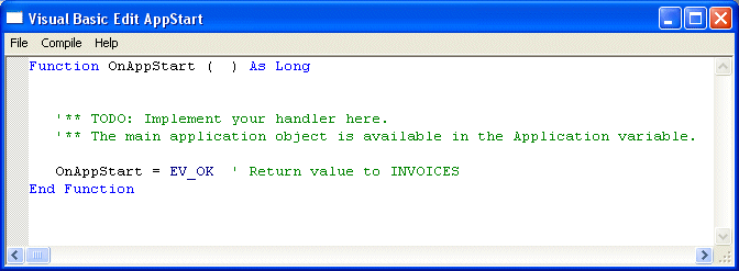 INVOICES' internal VBA engine is recommended only for simple debugging or status messages. We strongly advise against using the VBA engine for production customizations. For those, use COM plug-ins. |