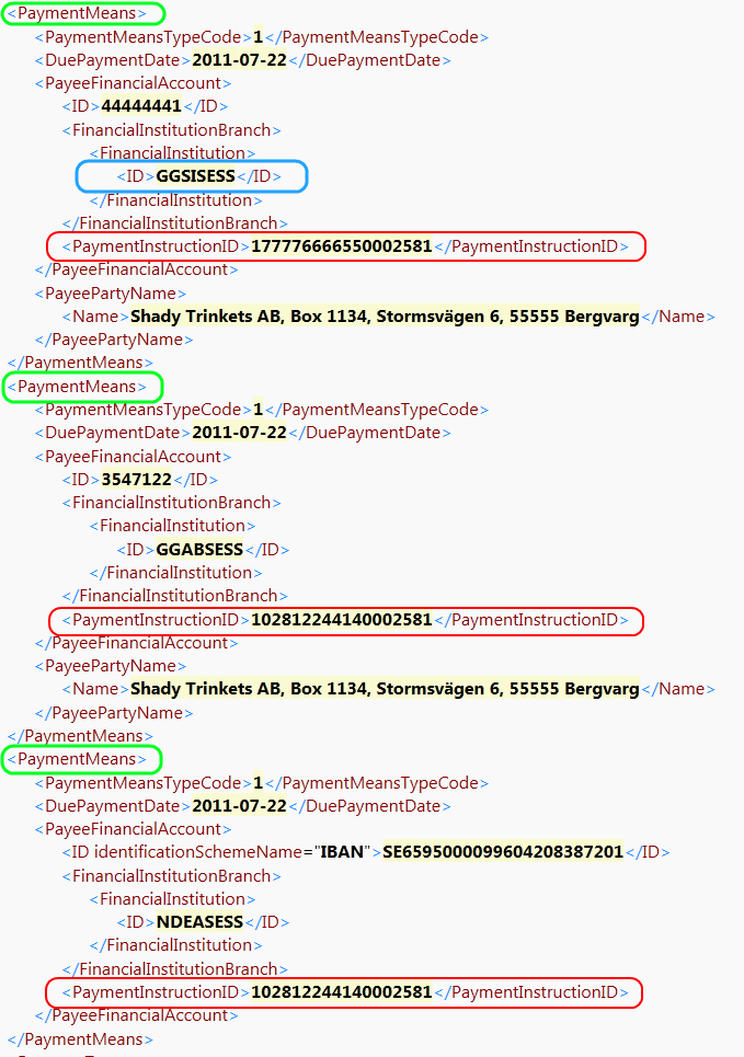 This example uses a Svefaktura invoice. We want to find the correct value for the Kofax ReadSoft Entrance field PaymentReferenceNumber. The expected path of this field in the Svefaktura XML invoice standard is /Invoice/cac:PaymentMeans/cac:PayeeFinancialAccount/cac:PaymentInstructionID. In our sample invoices, there are several instances of this XPath in the file. The one with the GGSISESS attribute is the correct one. Click the thumbnail to see an example: