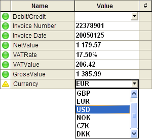 Every invoice profile created using Kofax ReadSoft Invoices 5-4 or later contains a Currency field. (In invoice profiles created using an earlier version of Kofax ReadSoft Invoices, this field is handled a bit differently.)