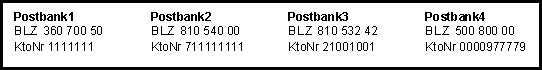 Postbank1, BLZ 360 700 50, Account number 1111111 or Postbank2, BLZ 810 540 00, Account number 711111111