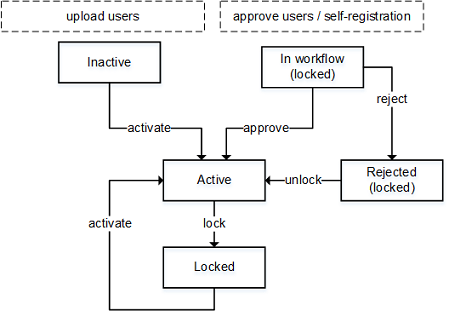 In both cases a corresponding workflow is triggered and sent to an administrative user for processing. The administrative user then has to manually approve the user in order to activate the user account. For more information, see Approve self-registration workflows.