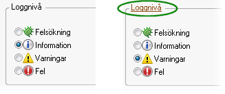Välj önskad loggnivå (beskrivs närmare under Ställa in loggning). | |