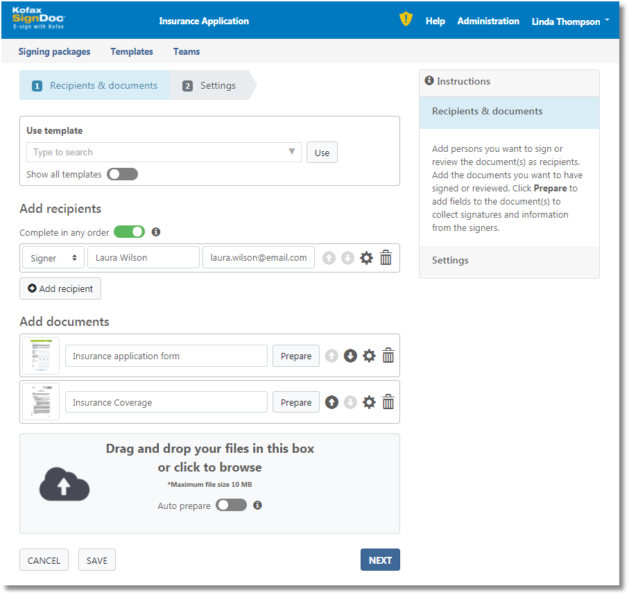 Add documents to the package. You can upload one or more documents either by file upload or by drag & drop.