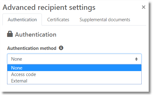 Clicking the gear will open the advanced recipient settings for authentication, certificates and supplemental documents.