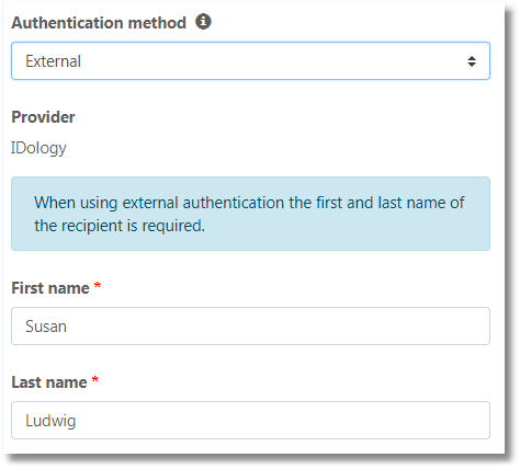 Authentication is based on an external authentication provider. This feature is only available if configured for your account. When using external authentication the recipient’s first and last name is required.