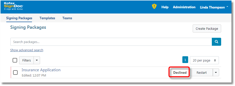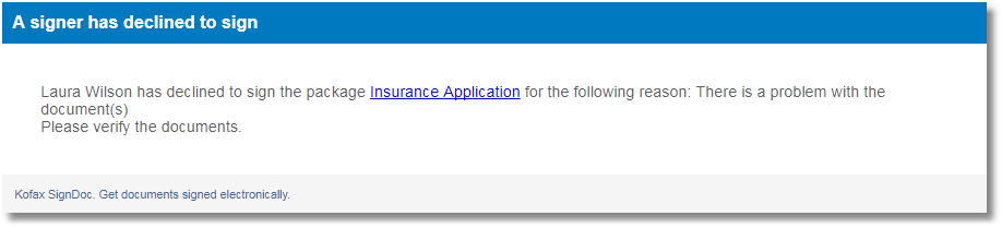 The recipient will see a message that the signing has been declined and the package initiator has been informed.