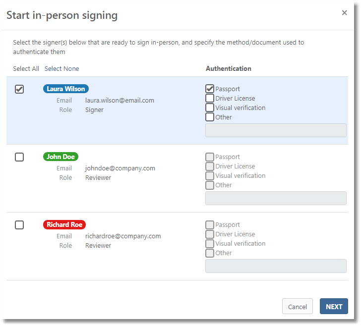 Select one or more participants for the in-person signing session. You will need to manually authenticate the signers before you can start the in-person signing session. Select one or more authentication mechanisms for each of participant. You can also add a text comment in the other field.