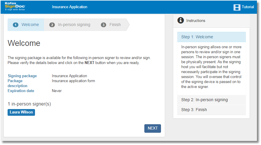 In-person signing allows one or more persons to review and/or sign the documents with the assistance of the signing host (the account holder). The participants of the signing session need to be physically present. The signing host will facilitate but not necessarily participate in the signing session. The signing host will oversee that control of the signing device is passed on to the active signer.