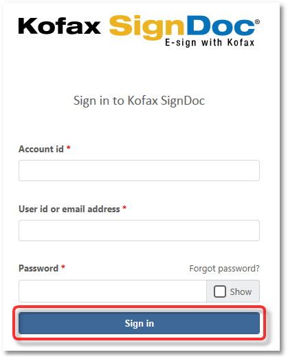 4.Type your user id or email address and password and click Sign in. In some instances, you will also be asked to enter your account id. The account id will have been provided to you when you purchased SignDoc Standard and is unique to your (or your company’s) account.