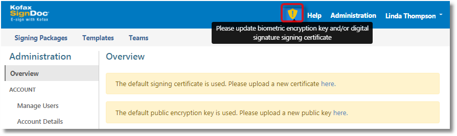 If no biometric key is set here, a default biometric key will be used, and a warning will appear at the top of each SignDoc Standard page instructing the administrator to update the biometric key.