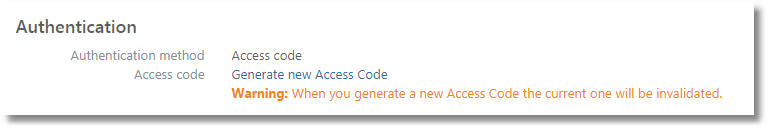 By clicking Generate new Access Code link, the dialog with new generated access code will be displayed: