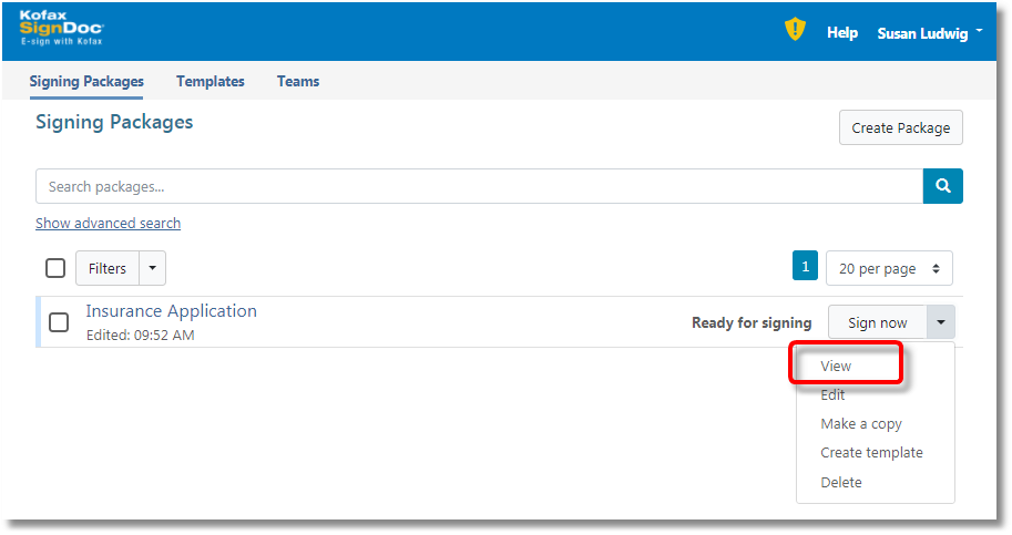 A user can view the details of a package when selecting View on the Signing Packages page for a dedicated package.