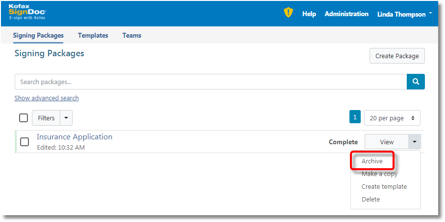 A user, which has access to a signing package, can archive a signing package when it is completed. It can be done in Signing Packages and Package Details views (see Void a signing package).