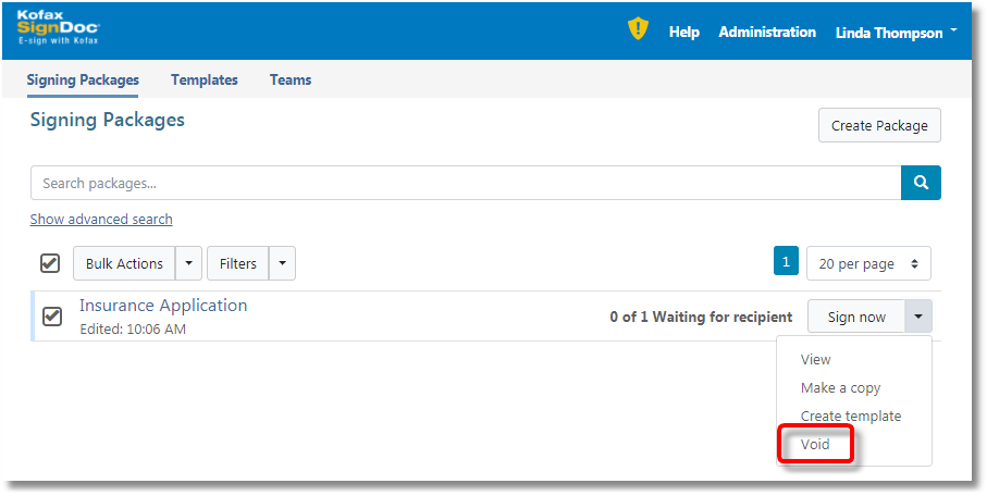 A user, which has access to a signing package, can cancel the package as long as it is not completed. It is possible to void a set of signing packages in Signing Packages view: