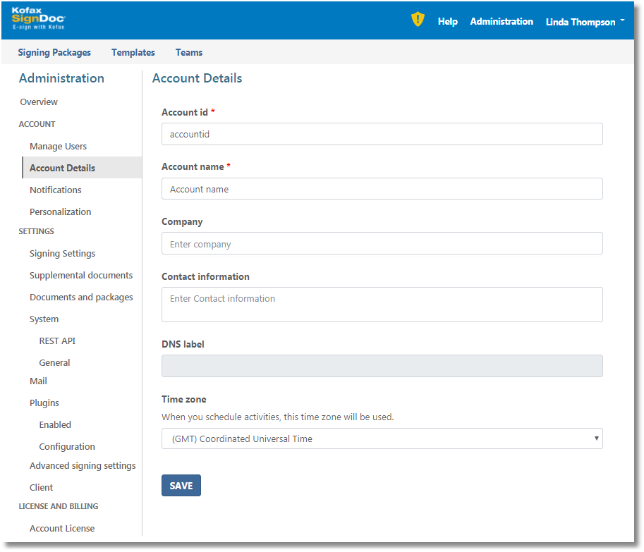 This label allows this SignDoc Standard account to be accessible via a subdomain. For example if your company’s account should be accessible via the URL yourcompany.kofax-signdoc.com, the label "yourcompany" will appear in the DNS label field. This field is configured upon creation of this account by the system administrator and is not editable.