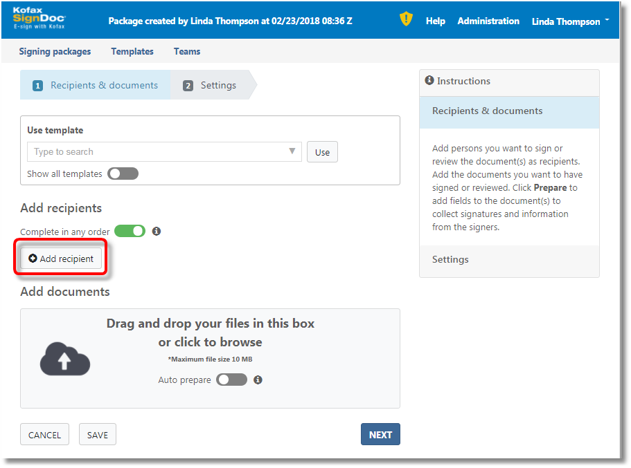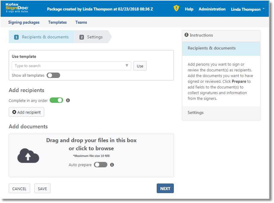 Add documents to the package. You can upload one or more documents either by file upload or by drag & drop.