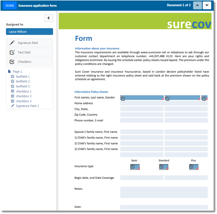 Note If you are uploading a PDF document with form fields SignDoc Standard detects the fields and keep them (no conversion to a proprietary fields).
