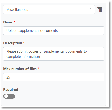 To remove previously added supplemental document use trash icon button located to the right of the document type dropdown.