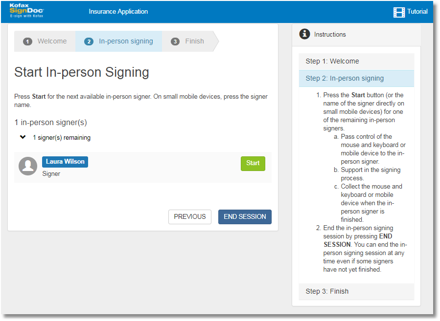 In-person signing allows one or more persons to review and/or sign the documents with the assistance of the signing host (the account holder). The participants of the signing session need to be physically present. The signing host will facilitate but not necessarily participate in the signing session. The signing host will oversee that control of the signing device is passed on to the active signer.