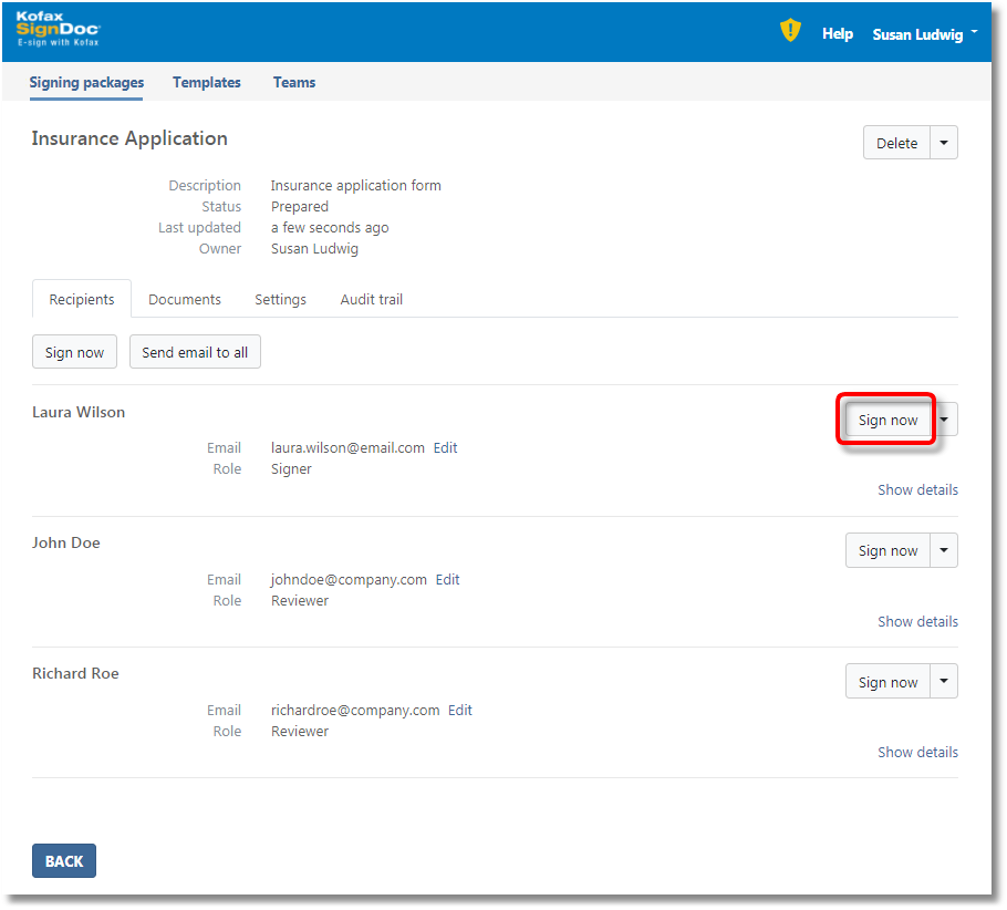 •Common button Sign now to start new signing session for multiple signers. In-person signing session can be started for multiple recipients, which have not finished the signing ceremony in a signing package prepared for signing.