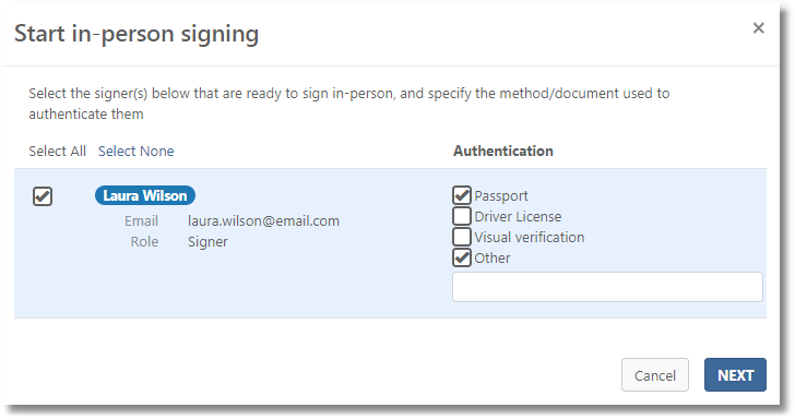 Select one or more participants for the in-person signing session. You will need to manually authenticate the signers before you can start the in-person signing session. Select one or more authentication mechanisms for each of participant. You can also add a text comment in the other field.