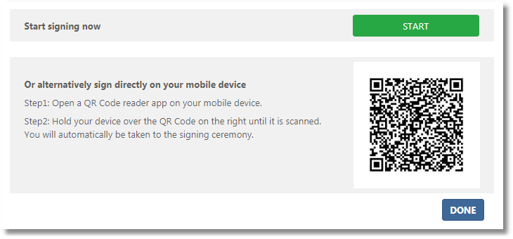 After the signers are selected, by clicking the NEXT button, a new modal dialog appears containing the QR code and a START button which starts the in-person signing ceremony.