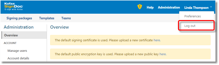 To log out, click Log out. It returns you to the SignDoc Standard portal page.